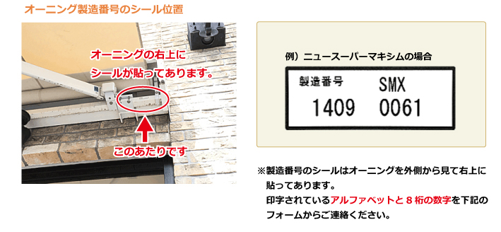 オーニングの右上部分にあるシールに商品情報が記載されていますので、ご確認のうえ、フォームに必要事項を入力してご連絡下さい。